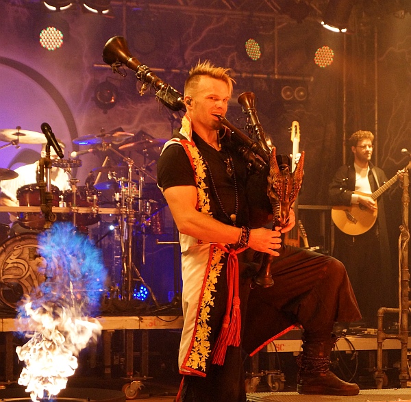 Das Motto „Je später der Abend, desto heißer die Show“ ist für die Jungs von SALTATIO MORTIS Programm, denn die Feuerkanonen, die entlang der Bühne positioniert sind, arbeiten scheinbar am Anschlag und grillen die eine oder andere Fleischmütze in den ersten Reihen. Die Illumination der Bühne wirkt durch die permanenten Eruptionen feuriger Gasbälle mystisch-fantastisch. Alea der Bescheidene, Frontmann und Dudelsack-spielender Derwisch, ist in Hochform und feuert das begeistert mitgehende Publikum ein ums andere Mal zum Mitsingen und -tanzen auf.