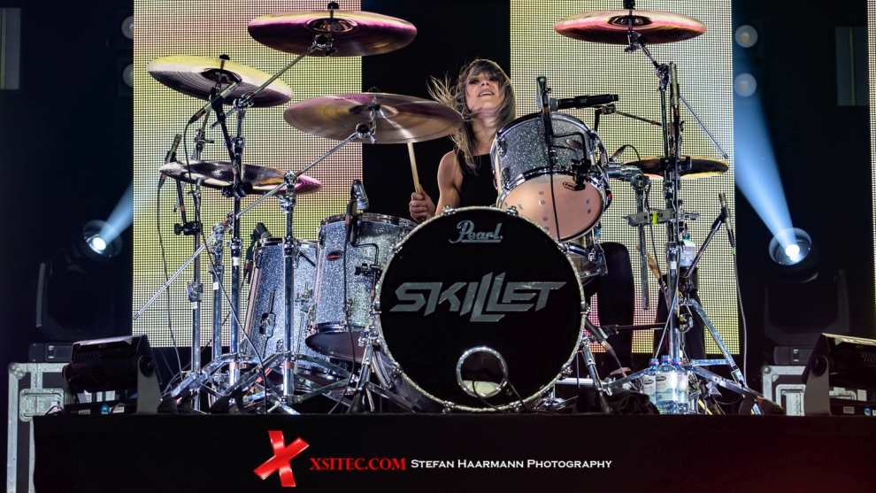 „Rise“ in Anschluss, Titel-Track des 2013er Albums haut in dieselbe Kerbe und zeigt die melodischen Stärken der Band, wobei hier der Gesang von Schlagzeugerin Jen Ledger eine tragende Säule darstellt. Zu „Surviving The Game“ gibt es die schon berühmte Showeinlage John Coopers, der es sich nicht nehmen lässt, das Publikum in Trockeneisnebel zu hüllen. SKILLET gönnen sich und dem Publikum indessen auch im weiteren Verlauf keine Verschnaufpausen. Das Ergebnis ist brachial, mitreißend und unwiderstehlich. Die ersten Töne des Klassikers „Whispers In The Dark“vom Mega-Album „Comatose“ lassen orkanartigen Jubel ausbrechen, wird hier doch ein Song gespielt, der auf keiner Setlist der Band fehlen darf.