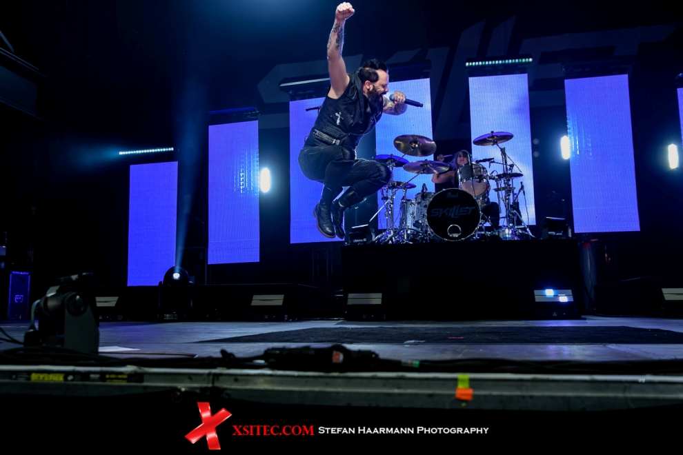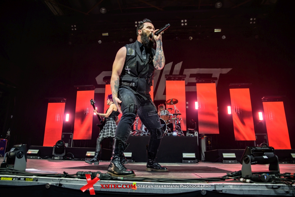 Dann aber ist es Zeit für den Headliner aus Memphis. Waren die beiden Einheizer bereits energiegeladen und voller Elan, kommen SKILLET allerdings im Vergleich wie ein Hurrikan aus der Garderobe. Nach dem Intro zu „Feel Invincible“ entfacht die Band um John Cooper und seine Ehefrau Korey ein regelrechtes Gewitter und hämmert den Song vom 2018er Album „Unleashed“ mit unglaublicher Vehemenz in die Menge. Motiviert bis in die Haarspitzen zeigen SKILLET, warum sie seit der Gründung im Jahr 1996 zu den erfolgreichsten Rockbands der USA zählen. Cooper, der im Laufe des Konzerts einräumt, dass die „Fans in Deutschland härter rocken als in den Staaten“, freut sich riesig über die Resonanz des Publikums, das begeistert mitgeht. Korey Cooper springt wie ein Derwisch über die Bühne und scheint komplett losgelöst von den anderen in ihrer eigenen Welt unterwegs zu sein. Hier merkt man deutlich, dass sich trotz der Rastlosigkeit der Band keine Routine in Form von Stillstand breit gemacht hat. Das permanente „auf Tour sein“ ist die Basis für ein blindes Verständnis, da jeder der Akteure zu jedem Zeitpunkt des Gigs weiß, was seine Bandkollegen als nächstes unternehmen werden.