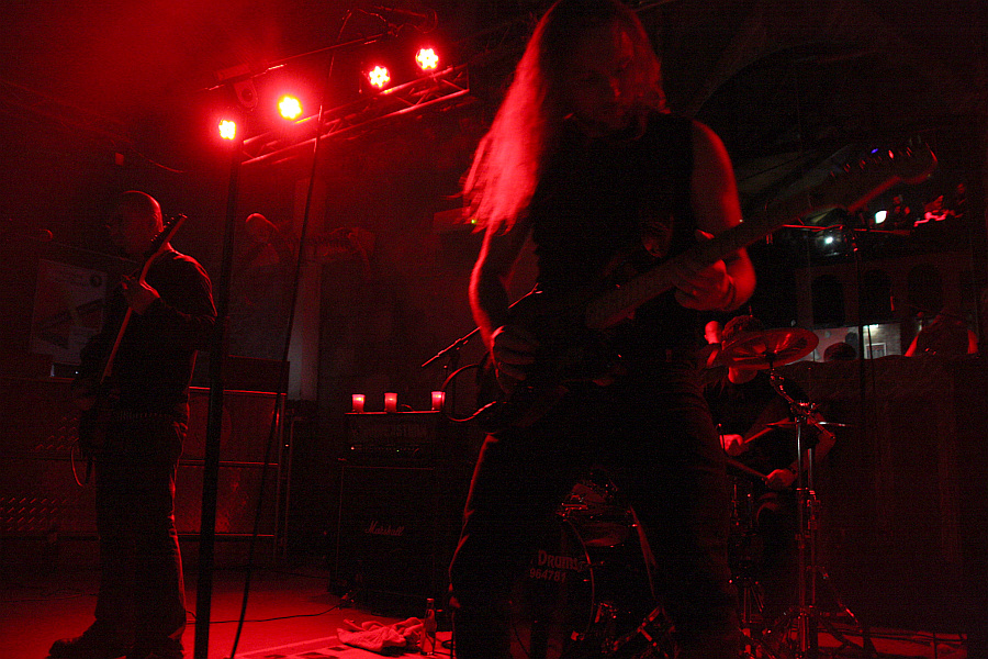 Die Macher des Festivals sind seit Frühjahr 2011 in Sachen Live-Events tätig und stellen regelmäßig interessante Konzerte aus dem modernen Extrem-Metal-Bereich auf die Beine. Eine gewisse Erfahrung ist also vorhanden, insofern überrascht es, dass man bei Stage Secrets Festival kein sonderlich gutes Händchen bei der Auswahl der Tontechniker hat. Zwar haben die meisten Bands einen zumindest passablen Sound, doch oft dauert es eine kleine Ewigkeit, bis man dorthin gekommen ist. Vor allem die Umbaupause vor NOCTE OBDUCTA zieht sich scheinbar endlos und stellt die Besucher auf eine Geduldsprobe. Defekte Mikrofone und Kabel, Monitorboxen, die keinen Mucks von sich geben, Probleme mit der Einstellung der Monitore – alles keine Riesenprobleme, die aber leider nicht schnell gelöst werden können. Ein weiterer Kritikpunkt ist bei der Beleuchtung der Bühne zu sehen. Zwar mag es der Atmosphäre förderlich sein, wenn möglichst wenig Licht die Bühne erhellt, doch bei den meisten Bands war es so wenig Licht, dass man ohne High-End-Equipment kaum in der Lage war, ohne Blitzlicht vernünftige Fotos zu machen – was man an den Bildern in diesem Bericht sehen dürfte. Und Bilder, die mit Blitz geschossen werden, sind einfach zu leblos.