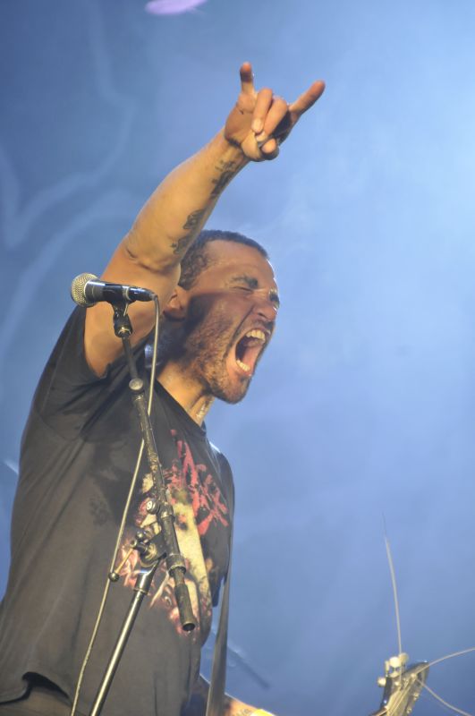 Um es mal vorweg zu sagen: leider sehr durchwachsen. Entweder war Burton C. Bell krank oder hatte irgendwas vorher eingeschmissen, keine Ahnung. Die Gesangsleistung (in den cleanen Parts) war leider das Schwächste am Gig. Burton sah fertig aus – aufgequollenes Gesicht, kleine Augen. Ich kam am Ende vom ersten Song "Shock" an und musste mich erst mal ein paar Songs in diese oft nur mittelmäßige Sängerleistung rein hören. "Powershifter" beispielsweise wurde mal völlig verkackt in den cleanen Parts (was ja jetzt nichts Neues ist), man muss das leider so deutlich sagen. Fairerweise sei hinterher geschoben, dass "Recharger" vom gerade neu rausgekommenen Album "The Industrialist" sauber gesungen wurde und live rockt wie Sau. Daran merkt man, dass sich Burton C. Bell beim Songwriting sinnigerweise an den stimmlich zu schaffenden Tonlagen orientiert hat, das klappte gesanglich einwandfrei. Das Festivalpublikum verzieh der Band aber diese zumeist stimmlich schwache Leistung. Was zum einen daran lag, dass mit dem Song-Quartett "Demanufacture", "Self Bias Resistor", "Zero Signal" und "Replica" vom 95er Gottalbum "Demanufacture" der Gig beendet wurde. Und zum anderen bestimmt daran lag, dass ein glänzend aufgelegter Dino Cazares sich am Bühnenrand permanent bemühte, in Kontakt mit den Fans zu bleiben. Da wurde gegrinst, gescherzt und mit den ersten Reihen interagiert, was das Zeug hergab. Auch Bassist Matt DeVries und Neu-Schlagzeuger Mike Heller gaben durchaus eine gute Bühnen-Figur ab. Wenn Sänger Burton C. Bell nicht gefühlt schon nach dem vierten Song völlig aus der Puste gewesen wäre, wäre das alles echt noch einen Tacken knackiger geworden. So bleibt bei mir eher die leise Sorge, ob der FEAR FACTORY Frontmann die noch kommenden Festivalgigs sowie die im Spätherbst/Winter anstehende Tour mit Devin Townsend ohne größere gesundheitliche Probleme über die Bühne bekommen wird.