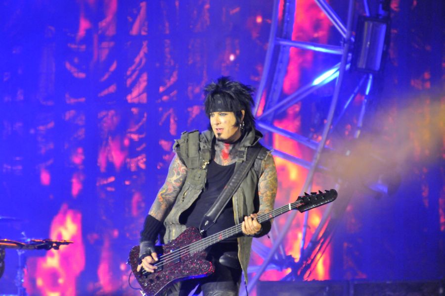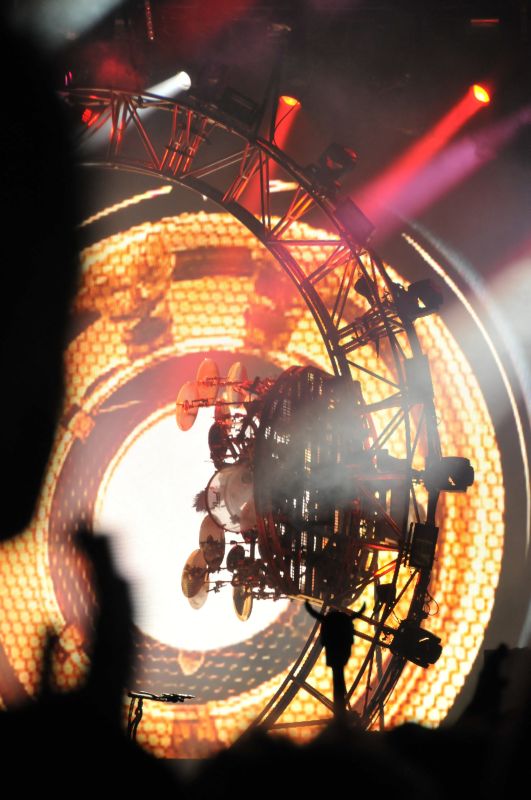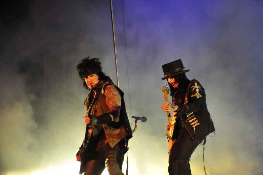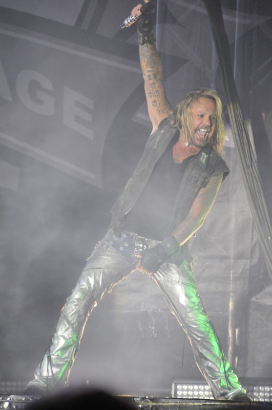 Ich versammelte mich mit nahezu allen Ballroom Crew Campleuten vor der Hauptbühne und wir blieben im vorderen rechten Drittel etwa in Höhe des Bühnenausläufers auf einer kleinen Bodenanhöhe stehen. Denn nun kann der Samstags-Headliner. MÖTLEY CRÜE waren nach 2005 zum zweiten Mal der Sweden Rock Festival Headliner und ich habe den Gig von 2005 in allerbester Erinnerung, als ca. 30.000 Leute eine einzige große Party feierten. Um es vorweg zu nehmen: leider konnte MÖTLEY CRÜE das dieses Jahr nicht wiederholen in meinen Augen. 2005 war die Bühne und die Show passend zur darauf erscheinenden DVD zirkusartig aufgezogen. Dieses Jahr dominierte die abenteuerliche Mikrokonstruktion von Nikki Sixx (sein Mikro hin an einer wuchtigen Stahlstabkonstruktion von der Decke) sowie der Drum-Rollercoaster von Tommy Lee, welchen die CRÜE schon bei den Vegas Shows zu Beginn des Jahres sowie auf den anderen Tour Dates dieses Jahr dabei hatte. Das Drumkit ist dabei fest in einen riesigen Stahlkreis eingebaut und erlaubt es Tommy Lee innerhalb dieses Kreises mit seinem Drumkit 360°-Kreise zu drehen – während er spielt, wohlgemerkt.