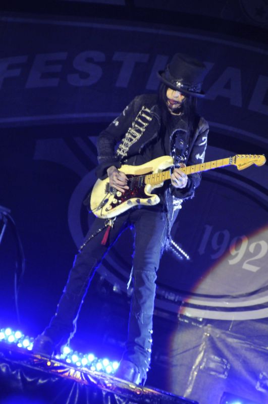 Die Band startete mit "Wild Side" und "Life Wire" ins Set. Es gab keine größeren Songüberraschungen, das war das altbewährte MÖTLEY CRÜE Hit-Paket, was aber auch völlig in Ordnung ging. Nichts anderes wollen die Leute auf einem Festival hören. Allerdings brauchte ich wirklich ungefähr ein Drittel des Gigs Zeit, um mich von meinem inneren Schockzustand zu erholen: zum einen sah Mick Mars nicht nur (absichtlich) gruselig aus, der Mann bewegt sich krankheitsbedingt halt mittlerweile auch so langsam und vornübergebeugt, dass mich der Anblick schon ein klein wenig entsetzte. Da frage ich mich halt wirklich, wie lange er das noch physisch alles mitmachen kann. Spielerisch gab es nichts zu meckern, der Mann ist nach wie vor ein super Gitarrist. Zum anderen war ich alles andere als erfreut über die (sorry, aber ich muss das so drastisch ausdrücken) miese Gesangsleistung von Vince Neil. Schon klar, der Gute konnte noch nie perfekt singen, aber ich erwarte verdammt noch mal korrekte Einsätze bei einer Band wie MÖTLEY CRÜE. Er klang ungefähr die Hälfte des Auftrittes, als ob er Mickey Mouse noch fix vor dem Abflug über den großen Teich verschluckt hätte, setzte entweder zu früh oder zu spät mit dem Gesang ein. Im Laufe des Gigs wurde das endlich besser, "Home Sweet Home" war sogar erstaunlich ok. Ich bin mir nicht sicher, ob ich mir das sonst bis zum Ende hin hätte anhören können. Highlight des gesamten Gigs war in der Tat die wirklich beeindruckende Lichtshow inklusive Riesenprojektionswand hinter dem Drumkit. Und besonders natürlich das Drum-Solo von Tommy Lee, als er zu relativ progressiv-elektroartigen Klängen sein Solo im sich durch den Rollercoaster routierenden Drumkit teilweise kopfüber spielte! Natürlich ließ er es sich nicht nehmen, sich für eine weitere Zusatzrunde ein Mädel aus dem Publikum zu fischen und es auf den fix dazu montierten zweiten Sitz hinter sich zu setzen.