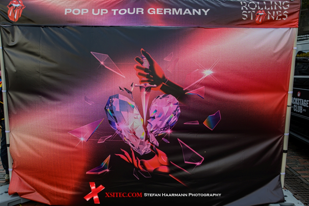 Auf dem Oberdeck des „Hackney Diamonds“-Busses besteht die Möglichkeit, einen Blick über den Marktplatz zu werfen, der gut gefüllt ist. Rechts des Busses steht der Merch-Stand, an dem die Sonderedition „RS No. 9 CARNABY“ in schwerem, rotem Vinyl reißenden Absatz findet. Zudem gibt es nebenan bei den Give-Aways original ROLLING STONES-Plektren, Sticker und Buttons, die echten Fans die Freudentränen in die Augen treiben.