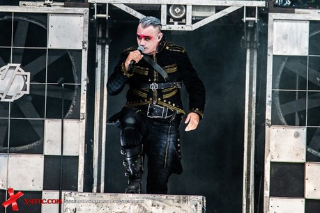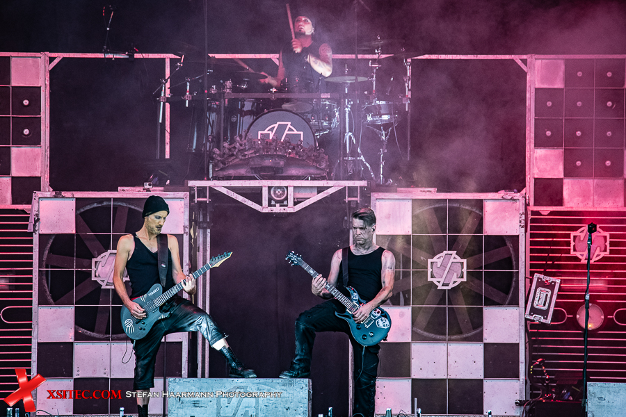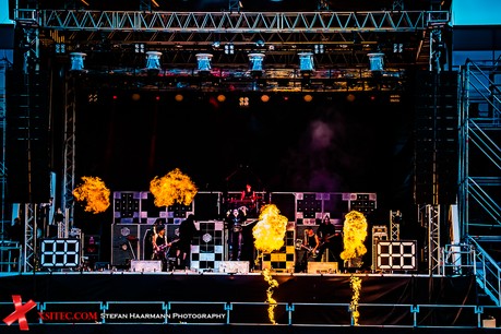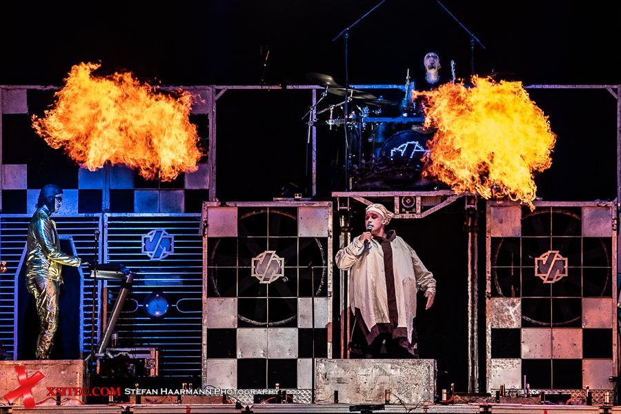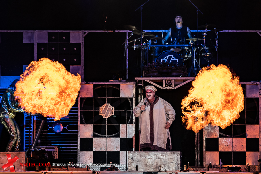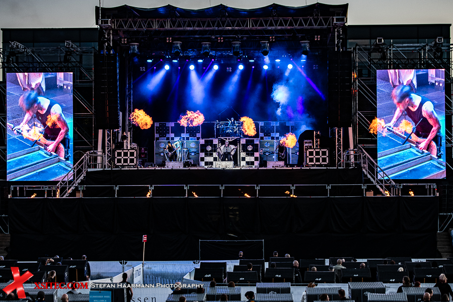 Gestartet wird die Show mit einer brachialen Version des RAMMSTEIN-Klassikers „Rammlied“, in den die Band scheinbar ihre über die vergangenen Monate angestaute Spielfreude hineinlegt. Und während die Band in der Lanxess-Arena durch die Form der Bühne zu reichlich Improvisationen gezwungen war, sorgt die hier im SparkassenPark installierte Großbühne für das gewisse Momentum der Behaglichkeit seitens der Protagonisten, die daher auch wie entfesselt aufspielen. Die ersten Pyros tauchen die Szenerie in ein Meer aus züngelnden, blitzenden Lichtern, was die Zuschauer mit tosendem Applaus quittieren, „Feuer frei“ direkt im Anschluss ist ja schon aufgrund des Titel zu einer Steigerung prädestiniert, was auch in der Umsetzung prächtig gelingt.