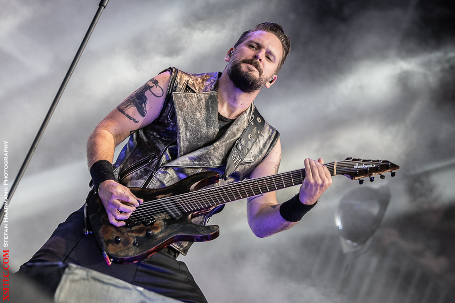 Pünktlich zum Start der Abendkonzerte, reißt dann auch die bis dato dichte Wolkendecke auf und taucht das Infield in goldene Farbtöne. Mit den Niederländern von WITHIN TEMPTATION steht eine Band auf der Bühne, die den Symphonic Metal schon seit ihrer Gründung im Jahr 1996 prägen. Auch das aktuelle Album „Resist“ thront weit über dem Durchschnitt des Genres. Sharon den Adel und ihre Mitstreiter habe daher auch keine Mühe, das Infield, das nun wieder rappelvoll ist, auf ihre Seite zu ziehen. Neben der Frontfrau, die stets für die Showelemente zuständig ist, liefert auch ihre Band gnadenlos ab. Stefan Hellenblad, der die fetteste Axt aus dem Haus Jackson Guitars sein Eigen nennt, hämmert auf ein Instrument ein, das statt der gewöhnlichen sechs Saiten, derer acht besitzt. Das Bild hier im Fließtext wurde von ihm und auf dem offiziellen Intagram-Accout von WITHIN TEMPTATION geteilt, was den Fotografen selbstverständlich extrem erfreut hat.