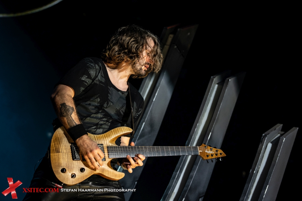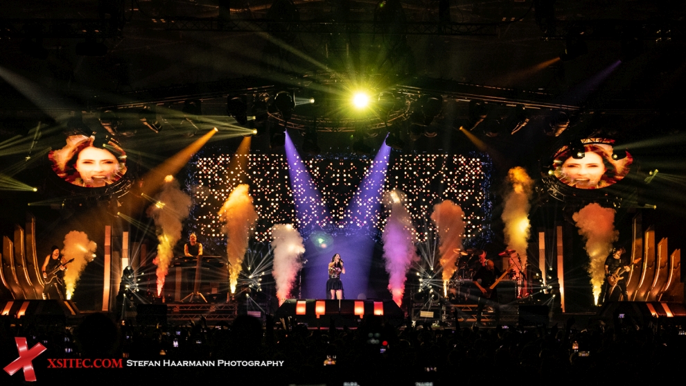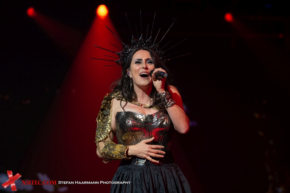 Nach diesem Paukenschlag geht es kurz darauf mit geballter Female-Fronted-Metal-Power weiter. Sharon den Adel betritt die Bühne in einer metallisch glänzenden Korsage. Dazu trägt sie eine schwarze Krone aus Metall, die nach dem ersten Song aber wieder in der Requisite verschwindet. Die LED-Wall im Hintergrund arbeiten nun nicht mehr nur in Form einer Silhouette, sondern bestahlt den kompletten Hintergrund, dazu werden auf den runden Monitoren zu beiden Seiten der Bühne immer wieder Video-Sequenzen eingeblendet.