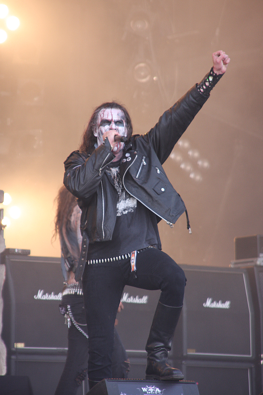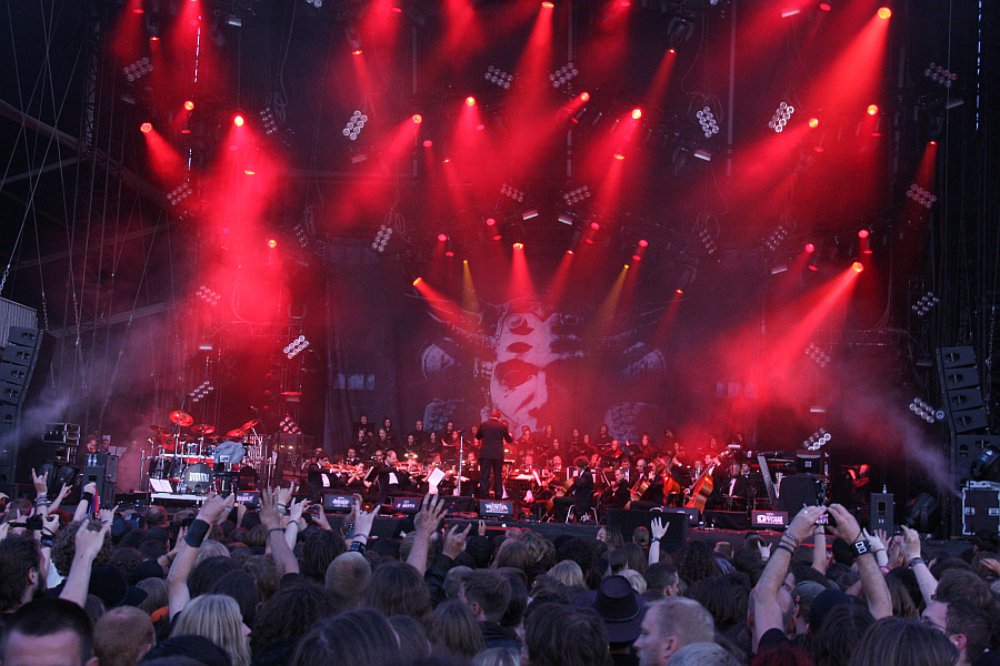 DIMMU BORGIR spielen nicht zum ersten Mal in Wacken, aber zum ersten Mal mit echtem Orchester und großem Chor, wodurch die Bühne natürlich brechend voll ist. Der symphonische Black Metal der Band eignet sich natürlich perfekt für eine solche Umsetzung, bedingt aber, dass der Sound auch wirklich gut abgemischt ist, damit das Ergebnis auch wirklich überzeugen kann. Falls jemand die Aufzeichnung des ZDF gesehen hat und der Meinung ist, dass eben dies nicht der Fall war, dem sei gesagt: vor der Bühne ist der Sound wirklich perfekt und macht den Auftritt zu einem wirklich unvergesslichen Erlebnis. Was wohl auch für die Orchestermusiker gelten dürfte, von denen sich ein paar sogar schwarzmetallisch angemalt haben, wie man auf den großen Videoleinwänden sehen kann. Auch ist der Kontrast zwischen den Bühnenoutfits von Shagrath, Galder und Silenoz und dem klassichen Orchesteroutfit interessant anzusehen. Gespannt durfte man dahingehend sein, welche älteren Songs mit Orchester dargeboten werden. Dass viele Songs vom aktuellen Album "Abrahadabra" gespielt werden würden, ist klar, denn auf diesem Album haben DIMMU BORGIR ja auch mit einem echten Orchester gearbeitet. Und so werden zunächst ausschließlich Songs des leider recht schwach geratenen Albums gespielt. Andererseits muss man aber auch festhalten, dass eben diese Songs in der Livesituation mit Orchester und Chor wesentlich spannender sind, als auf dem Album.