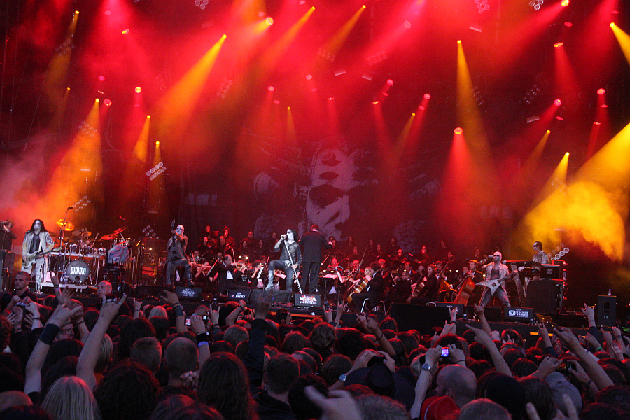 Der Auftritt von DJERV-Sängerin Agnete Kjølsrud in "Gateways" wird dank ihrer Ausstrahlung zu einem ersten Highlight. "Dimmu Borgir" wird zunächst nur von Chor und Orchester dargebracht, bevor (unnötigerweise) die Band mit einstimmt. DIMMU BORGIR fahren aber nicht nur musikalisch, sondern auf pyrotechnisch voll auf und so manch ein Orchestermusiker dürfte vielleicht Angst um sein Holzinstrument gehabt haben. Sieben Songs vom neuen Album werden gespielt, bevor das Programm dann auch endlich um Lieder von den anderen Alben ergänzt wird. "Eradication Instincts Defined" wird sehr stimmungsvoll ohne metallische Unterstützung dargeboten, danach geht die Post mit "Vredesbyrd", dem wahrhaft bombastischen "Progenies Of The Great Apocalypse" und "The Serpentine Offering" ab. Der Übersong "Kings Of The Carnival Creation" darf nicht fehlen, die Industrial-Nummer "Puritania" wirkt allerdings etwas fehl am Platze. Und wie sollte es anders sein, bricht mit den ersten Tönen von "Mourning Palace" ein gigantischer Jubelsturm los. Der spektakuläre Auftritt findet dann in "Perfection Or Vanity" einen ruhigen Ausklang. (ASZ)