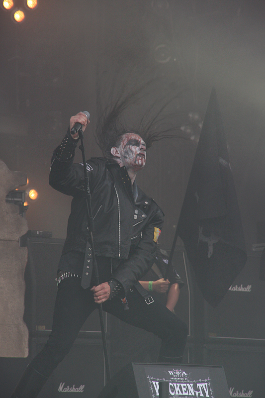 Nein, so richtig nachvollziehen konnten ENDSTILLE im Vorfeld nicht, warum sie den Freitag auf der Black Stage um 11 Uhr morgens eröffnen müssen. Die Kieler Black-Metal-Fregatte nimmt es aber mit Humor und lädt in Abwandlung ihres Songs "Frühlingserwachen" zum "Frühstückserwachen". Schade nur, dass es ihnen nicht möglich ist, wie geplant Kaffee an die Fans in der ersten Reihe zu verteilen. Zum Vertreiben des Katers kommt ihr Sound aber gerade recht, was auch zahlreiche Fans so sehen und so ist es schon ziemlich voll vor der Bühne, als die Jungs mit "Dominanz" in ihr einstündiges Set starten. Eine ausgebombte Ruine ziert die Bühne, auf der sich besonders Sänger Zingultus, Basser Cruor und Neugitarrist B.Killed viel bewegen, wie üblich feuert Wachtfels seine Riffs mit stoischer Gelassenheit in die Menge. Inzwischen wirken auch die Bewegungsabläufe von Zingultus absolut souverän, das leicht tolpatschig wirkende Gestampfe seiner Anfangszeit bei ENDSTILLE gehört der Vergangenheit an und er hat sich offenbar gut an die großen Bühnen gewöhnt. Weiter geht es im Set mit "Endstilles Reich" und "Satanarchie", zu dem mit Gasmaske bekleidete Fahnenträger auf die Bühne kommen, was schön martialisch wirkt. Im Laufe des Sets wird zum Glück auch der Sound immer besser, anfangs sind die Gitarren nämlich noch viel zu leise. "When Kathaaria Falls", "World Aflame" und "Frühlingserwachen" kommen weiterhin zum Zuge, bevor es mit "Anomie" und dem Klassiker "Navigator" langsam schon aufs Ende eines – wie immer – guten Auftritts zugeht. (ASZ)