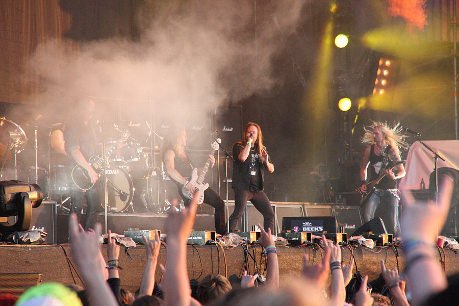 HAMMERFALL gerade ihr Werk verrichten. Hören tut man eh gut, da der Sound immer auch über die Boxen der Nebenbühne geleitet wird. Und etwas überraschend liefern die Schweden einen richtig guten Gig ab, an dem es so gut wie nichts auszusetzen gibt. Der Sound ist prima, die instrumentale Darbietung ziemlich tight und Frontmann Joacim Cans ist verdammt gut bei Stimme. Kein Wunder, dass die Stimmung hervorragend und ausgelassen ist und selbst vor der Black Stage stehen zahllose Fans und schütteln ihre Haare. HAMMERFALL zelebrieren nach eigener Aussage ihr 15-jähriges Wacken-Jubiläum und servieren dazu eine gelungene Setlist mit zahlreichen Hits wie "Heeding The Call", "Blood Bound", "Steel Meets Steel", "Renegade", "The Dragon Lies Bleeding", "Let The Hammer Fall" und "Hearts On Fire". Beide Daumen hoch für diese Performance, mit der HAMMERFALL ein bisschen die Überraschungssieger des diesjährigen Wacken Open Airs sind. Stark! (ASZ)