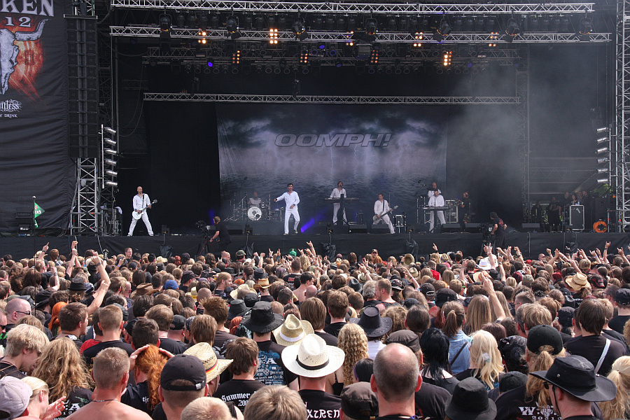 Die erfolgreichsten Zeiten von OOMPH! liegen inzwischen zwar schon ein paar Jahre zurück, aber trotzdem zieht die Band am frühen Nachmittag immer noch jede Menge Volk vor die Party Stage, das den Auftritt der Wolfsburger Electro-Rocker auch gehörig abfeiert. Einheitlich in ein Matrosenoutfit gewandet, erscheint man in Sieben-Mann-Stärke auf der Bühne, wobei man sich schon fragen darf, warum man gleich zwei Keyboarder braucht. Sänger Dero ist im Gesicht zudem wie der Joker aus Batman geschminkt, dürfte aber auch ohne diese Maskerade das Grinsen angesichts der Publikumsreaktionen nicht aus dem Gesicht bekommen. Musikalisch bieten die Herrschaften ein gelungenes Best-Of-Programm, bei dem die Hits "Labyrinth", "Gott ist ein Popstar" und "Augen auf" natürlich nicht fehlen dürfen. Besonders gut kommt "Träumst du" an, bei dem die Menge hüpft, während "Bis der Spiegel zerbricht" Teeniestar Justin Bieber gewidmet wird. 80er-Fans erfreuen sich am eingedeutschen Cover von BRONSKI BEATs "Smalltown Boy", was natürlich "Kleinstadtboy" heißt und wer schon lange Fan der Band ist, bekommt "Mitten ins Herz" aus dem Jahre 1995 kredenzt. Den Rest des Auftritts verfolgen wir dann aber nur noch mit einem Ohr, da die Merchandise- und Futterstände rund um die Party Stage noch nicht begutachtet sind. Und mit Trauer müssen wir festhalten, dass der Stand, an dem es letztes Jahr großartige Hausmannskost zu fairen Kursen gab, in diesem Jahr nicht dabei ist. Dafür gibt die Grabbelkiste vom Artworx-Stand einiges her, unter anderem drei KAMELOT-Shirts in Größe L für läppische 5,- € - eines davon muss natürlich verhaftet werden. (ASZ)