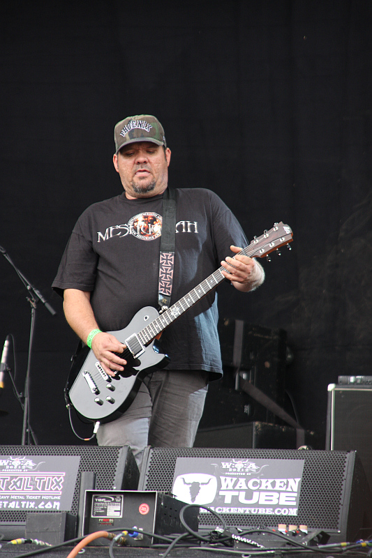 Die größte Frage vor einem SANCTUARY-Gig dreht sich bekanntlich um die stimmliche wie körperliche Verfassung von Sänger Warrel Dane. Da von den letzten Auftritten aber durchweg Positives zu vernehmen war, ist die Hoffnung auf ein gutes Konzert ebenso groß, wie die Vorfreude auf eine Live-Darbietung von Songs der beiden Götter-Alben "Refuge Denied" und "Into The Mirror Black". Um sich ein genaueres Bild zu machen, kann man überraschend problemlos bis in die vorderen Reihen vor der Black Metal Stage vorrücken, da das Interesse an der Power-Metal-Legende doch geringer ausfällt als erwartet. Es ist nicht wirklich leer, aber etwa direkt vorher bei SACRED REICH war doch wesentlich mehr los. Das Durchschnittsalter der anwesenden Fans ist aber auch deutlich höher als bei den meisten anderen Bands. Kann es wirklich sein, dass manche NEVERMORE-Fans nicht wissen, um welche Band es sich hier handelt? Nachdem das Intro beendet und das Banner gefallen ist, hätten diese Warrel Dane vielleicht spätestens an dem von ihm bekannten BEHEMOTH-Shirt unter der Lederjacke erkannt. Der Einstand mit dem wuchtigen "Eden Lies Obscured" lässt dann auch gleich mal aufatmen, denn der Frontmann ist stimmlich durchaus gut drauf. Auch in der Folge liefert er zwar keine Meisterleistung wie in früheren Zeiten ab und lässt etwa bei den hohen Tönen von "Future Tense" einige Schwächen erkennen, insgesamt singt er aber durchaus stabil. Auch körperlich macht er einen fitteren, schlankeren Eindruck als manch anderes Mal, einen leicht verstrahlten Eindruck macht er aber dennoch. Dass er bei "Die For My Sins" sein Mikro-Kabel rausreißt, kann schon mal passieren, aber er muss etwa öfter mal den Stand der Dinge vom Bühnenboden ablesen. Immerhin versucht er zwischen den Songs immer wieder das Publikum zu motivieren, was ihm im Verlauf auch immer besser gelingt. Nur zu den von ihm erwünschten gleichen Reaktionen zu "Battle Angels", wie ehemals bei NEVERMORE bei einem Wacken-Auftritt, wird es am Ende dann doch nicht reichen.
