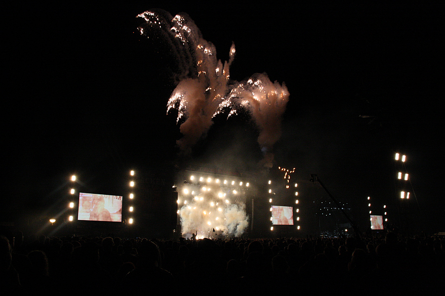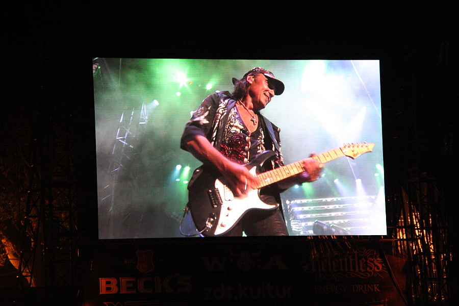 Vor dem Endspurt ist dann nochmal Nahrungsaufnahme angesagt, weshalb AMON AMARTH, die den Platz mit den SCORPIONS getauscht haben (oder tauschen mussten), nur leise am Zeltplatz vernommen werden. Ist aber auch nicht weiter tragisch, da sich bei den "HAMMERFALL des Death Metals" eh jeder Song gleich anhört… Das schöne Wetter am frühen Abend lässt die Hoffnung aufkeimen, dass es für den Rest des Tages trocken bleibt, am Horizont sieht es allerdings schon wieder düster aus, so dass die Nordlichter unseres Teams weiteren Regen vorhersagen. Also wird doch noch die wasserdichte Windbreakerjacke ausgepackt, bevor es zu den SCORPIONS Scorpionsgeht. Die legendären deutschen Hardrocker sind bekanntlich auf ihrer Abschieds-oder-vielleicht-auch-nicht-Tour und machen dabei auch mal wieder in Wacken Halt, sechs Jahre nach ihrer "Journey In Time" im Jahre 2006. Natürlich ist es vor der Bühne knackevoll (zumindest da, wo keine Tümpel sind), denn wer weiß schon, ob und wann man nochmal die Gelegenheit bekommt, Rudi, Klaus, Matthias und die Anderen live zu erleben. Zumindest soll diese Show die letzte Open Air Show in Deutschland sein. Für mich ist es auch wieder etwas Besonderes, die Band zu sehen, die maßgeblich zu meiner Metal-Sozialisation beigetragen hat. Wenn man als kleiner Junge nämlich in Vaters Plattensammlung auch die SCORPIONS entdeckt, bleibt das eben nicht ohne Folgen. Wie bei den anderen Headliner-Bands ist die Bühne auch bei den Hannoveranern eines großen Events absolut würdig aufgebaut und die LED-Leinwände sowie die Lichtshow und die Pyroeinlagen sorgen für große Augen. Wie es sich für eine Band dieser Größenordnung gehört, stehen die Herren natürlich in glitzernden Rockstaroutfits auf der Bühne und besonders Gitarrist Rudolf Schenker post auf seine unnachahmliche, irgendwie übertriebene, aber trotzdem sympathische Art und Weise – auch wenn er die Sonnenbrille nicht abnehmen mag. Soviel zur Optik, die Akustik kann da zunächst nicht mithalten. Bei den ersten Songs "Sting In The Tail", "Make It Real" und "Is There Anybody There?" ist der Sound nämlich noch so leise, dass man sich auf Höhe Mitte des Feldes problemlos in normaler Lautstärke unterhalten kann. Böse Erinnerungen an den nicht zu hörenden SLAYER-Auftritt vor ein paar Jahren werden wach, aber zum Glück bessert sich die Lage noch, auch wenn es nicht mehr so richtig laut wird. ScorpionsDie Band muss aber erst mal auf Touren kommen, denn die ersten paar Songs sind zwar fast alles Klassiker, jedoch eher solche der nicht ganz so harten Sorte. Es folgen nämlich zunächst mit "The Zoo", "Coast To Coast" und "Loving You Sunday Morning" Songs, bei denen eher Mitwippen als Durchdrehen angesagt ist. Mit "Rhythm Of Love" und "Raised On Rock" zieht man dann Härtegrad und Tempo leicht an, dummerweise fängt es zeitgleich aber nochmal zu regnen an. Und zwar nicht nur ein bisschen, sondern noch einmal so richtig. Weshalb Flucht in den VIP-Bereich angesagt ist, in dem man zwar das Bühnengeschehen auf einer Leinwand sehen kann, aber nicht mehr allzu viel hört. Was angesichts der noch folgenden Songs wie "Dynamite", "Blackout" und "Big City Nights" schade ist. Auch die Zugaben sehen wir nur auf der Leinwand, die haben es aber in sich. Zu "Coming Home" wird eine Statue auf die Bühne gerollt, die die Form der berühmten SCORPIONS-Pyramide hat und die dann von leichtbekleideten Damen funkensprühend mit der Flex bearbeitet wird. Und mit einem Stahlslip kann man es auch zwischen den Beinen mal ordentlich sprühen lassen. Die zweite Zugabe ist die wohl beste Ballade, die es je gab, gibt und geben wird: "Still Loving You". Dass "Rock You Like A Hurricane" den fulminanten Schlusspunkt setzt, überrascht wohl niemanden. (ASZ)