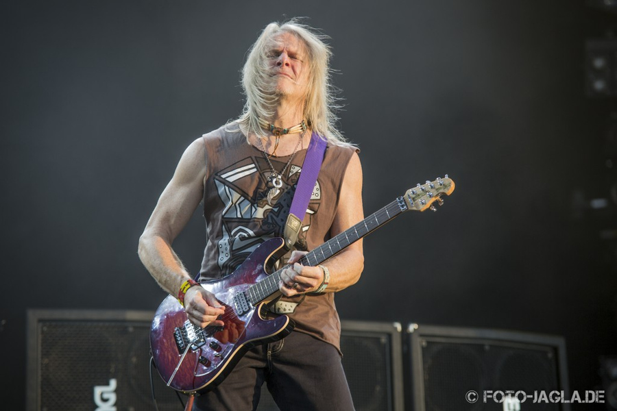 telt sich die unzähligen Riffs und Soli locker aus dem Handgelenk. Seinen großflächigen Soloausflug bekommt er natürlich auch, im Anschluss an "Strange Kind Of Woman". Und Don Airey? Der steht nicht einfach irgendwo an der Seite, sondern mit im Zentrum, schließlich ist er auch im Dauereinsatz, und macht dem verstorbenen Jon Lord alle Ehre. Äußerst unbefangen und mit unerwarteter Lockerheit spielt er auf und schafft es tatsächlich fast (und wenn auch nur für die Dauer dieses Konzerts), seinen unerreichbaren Vorgänger vergessen zu machen. Okay, das schafft man natürlich nicht wirklich, dafür sorgen auch die Jon-Lord-Bilder, die nach dem ersten Solo von Don Airey in "Lazy" an die Leinwand projiziert werden. Wie man die unvermeidlichste Hymne der Hardrockgeschichte noch interessant gestalten kann, darf man freudig erfahren, als zu "Smoke On The Water" Ex-Scorpions und Gitarrengenius Uli Jon Roth den Reigen der lebenden Musikerlegenden auf der Bühne erweitert. Das Wechselspiel der beiden Gitarren ist das Sahnehäubchen auf einen Song, der aber so oder so ein gefundenes Fressen für jedes Festival-Publikum ist. Nach erster Verabschiedung hat es der Zugabeblock dann noch mal in sich. Nach der Überleitung des instrumentalen "Green Onions", zieht ein 'Nah, nah-nah-nah, nah-nah-nah, nah-nah-nah' über das Gelände, denn auch "Hush" kennt ein jeder. Die Instrumentalisten nutzen dabei wie üblich noch mal die Gelegenheit, ihre Künste ausführlich zu zelebrieren. Gleiches gilt für "Black Night", das dem Ganzen dann die Krone aufsetzt und das Publikum noch mal richtig herausfordert. Danach ist Schluss. Dabei hätten die gesetzten Herrschaften, die keinerlei Ermüdungserscheinungen zeigen, mit Sicherheit noch gekonnt. Aber es warten da ja noch solche Nachwuchsrocker, die gleich mit dem Feuerzeug spielen wollen. (LS)