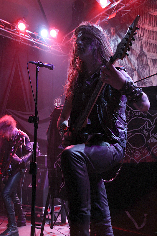 So haben es DEGIAL zunächst auch schwer, die Menge auf Betriebstemperatur zu bringen, was jedoch nicht nur an derer leichten Lethargie liegt, sondern auch am Sound, den die vier Schweden fabrizieren. Räudiger Death Metal der alten Schule, der jedoch keineswegs eingängig stumpf, sondern recht komplex und dadurch schwerer nachvollziehbar ist, wenn man die Songs nicht kennt, ist eben auch keine Musik, zu der man auf Anhieb abgehen kann. DEGIAL positionieren sich irgendwo zwischen ganz frühen DISMEMBER und MORBID ANGEL und versehen ihre Interpretation mit einer schwarzmetallischen Kante, die sparsam eingesetzten Harmonien haben DISSECTION-Flair, was ein stimmiges Package mit WATAIN ergibt. Die Songs des Debütalbums "Death's Striking Wings" werden von DEGIAL mit recht beeindruckender Sicherheit dargeboten und auch die vielen Rhtyhmus- und Tempowechsel bringen die Band nicht aus dem Konzept. Das besteht im übrigen darin, auf Kommunikation mit dem Publikum zu verzichten und die Songs ohne größere Unterbrechung herunterzuholzen. Dementsprechend unaufgeregt ist auch die Bühnenshow, es gibt keinerlei überflüssiges Gehampel und Gepose, sondern mit den Haaren im getünchten Gesicht wird in sich gekehrt gebangt, wo es gerade passt, ansonsten beschränkt sich die nahezu komplett in Leder gekleidete Band auf eine solide musikalische Darbietung.