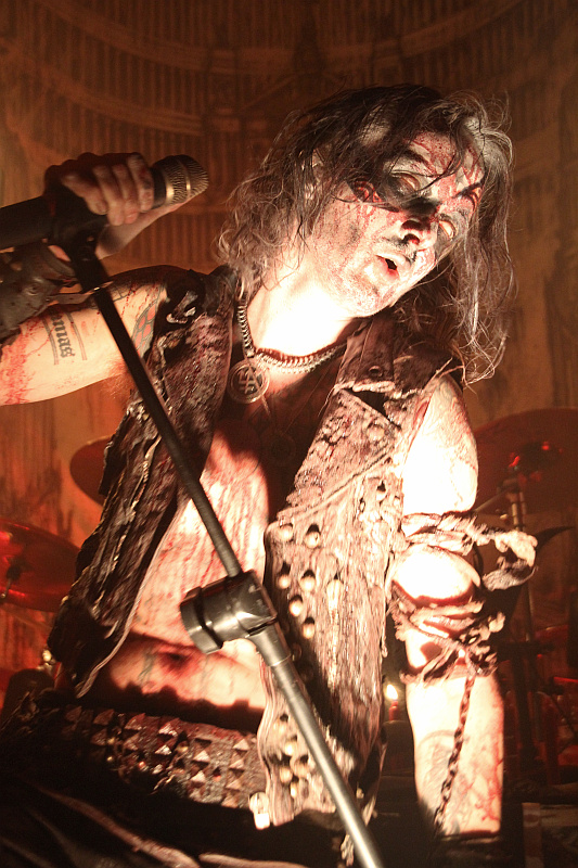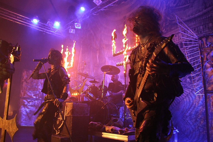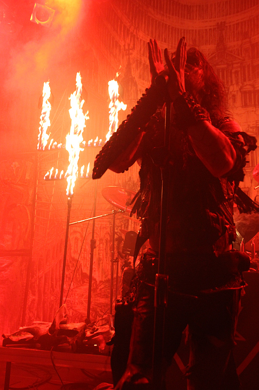 Im Vordergrund stehen die ebenfalls bekannten umgedrehten Kreuze mit Tierschädeln, auf der Bühne verteilt liegen viele Knochen und direkt vor dem Schlagzeug steht der kleine Altar, an dem Erik im Verlauf des Konzertes immer wieder rituelle Handlungen vornimmt. Verrottende Tierkadaver macht man keine aus und auch wenn die Band in ihren zerlumpten Bühnenoutfits immer ein bisschen modrig riecht, hält sich die Geruchsbelästigung in engen Grenzen. Unter großem Jubel und zu den eröffnenden Klängen von "Night Vision" kommt Erik mit brennenden Holzstäben auf die Bühne, um die beiden Dreizacke in Flammen zu setzen. Das will beim Linken nicht so recht funktionieren, was den Sänger sichtlich frustriert und wütend schleudert er die Holzstäbe von sich - im Fotograben muss man kurz in Deckung gehen. Das kleine technische Problem ist aber schnell behoben und so züngeln dann wenig später auf beiden Seiten die Flammen nach oben. In blutrotes Licht getaucht, geht es mit dem rasenden "De Profundis" weiter und Erik zieht schnell alle Register. Er windet sich wie eine Schlange um den Mikrofonständer, zuckt wie besessen und lässt sich von unten anstrahlen, um seinem Gesicht eine dämonische Wirkung zu verleihen. Man merkt dem Frontmann zu jeder Sekunde an, dass er seine Musik mit jeder Faser seines Körpers lebt, davon wiederum lebt auch ein WATAIN-Konzert.